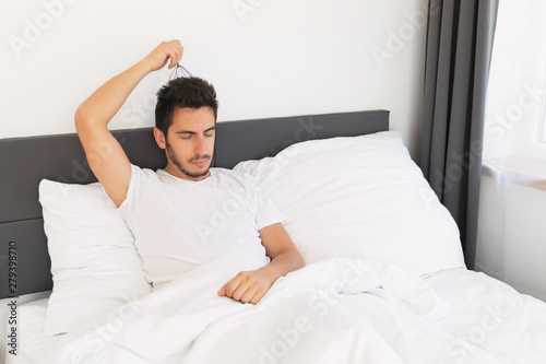 Young handsome man with a beard sits in his bed. He makes himself a head massage with a special hand massager.