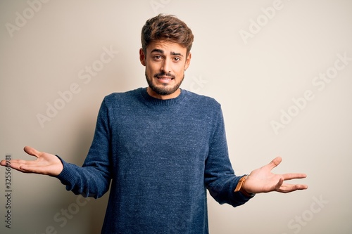 Young handsome man with beard wearing casual sweater standing over white background clueless and confused expression with arms and hands raised. Doubt concept.