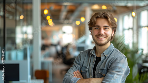 young handsome man with blue eyes on the background of a modern IT office, worker, programmer, professional, designer, guy, boy, portrait, smile, space for text, coworking, open space, people, person