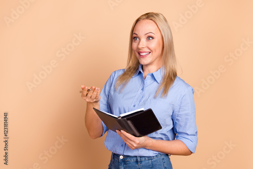 female, woman, blond, hair, businesswoman, beige, background, blue, shirt, striped, young, mature, happy, smile, planner, holding, work, casual attire, style, fashion, stylish, trendy, professional, successful, agent, manager, business, job, men at work, model, leisure, funny, advertising, shopping, promoting, notebook, gesture, presenting, conversation, expression, confident, communicating, engagement, consulting, corporate, occupation, book, writing