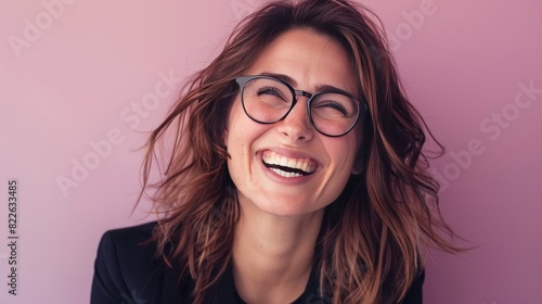 Young happy cheerful professional business woman, happy laughing female office worker wearing glasses looking away, light lila background, 16:9