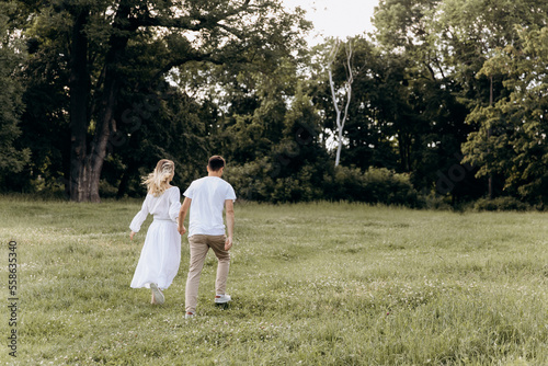 young happy couple running hand in hand in the countryside. young family concept. copy space