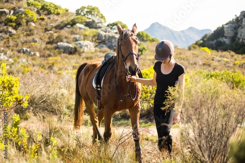 young adult, woman, female, caucasian, countryside, nature, parkland, horse, animal, horseriding, rural, recreational pursuit, equestrianism, pet, love, friendship, pasture, paddock, casual clothes, happiness, calm, peaceful, relaxing, content, sunlight, spring, summer, walking, leading, outdoors