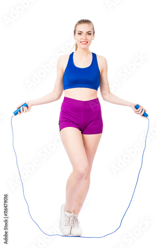 Young healthy girl fitness with a skipping rope isolated on white background