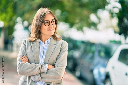 Young hispanic businesswoman with arms crossed smiling happy at the city