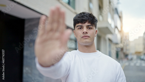 young, hispanic, man, male, guy, adult, person, portrait, photogenic, attractive, expression, racked, standing, serious, unhappy, angry, anger, furious, stop, hand, palm, prohibited, prohibition, forbidden, no, rejection, denied, reject, sunlight, sunny, street, town, city, urban, road, outdoors, outside, exterior, background