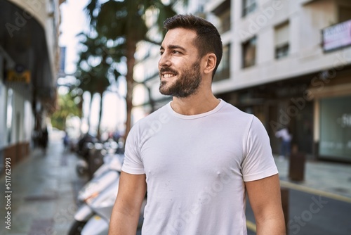 young, hispanic, man, male, adult, photogenic, beard, person, portrait, guy, happy, happiness, confident, cheerful, confidence, looking, cool, smile, lifestyle, expression, positive, joy, smiling, laughing, enjoy, fun, funny, laugh, racked, standing, walk, walking, sunlight, sunny, fashion, casual attire, t-shirt, clothes, street, city, urban, town, outdoors, exterior, road, background