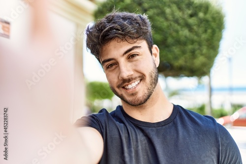 Young hispanic man smiling happy making selfie by the camera at the city.