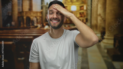 Young hispanic man smiling indoors at church surrounded by architectural faith elements and religious atmosphere, wearing casual white shirt with relaxed demeanor.