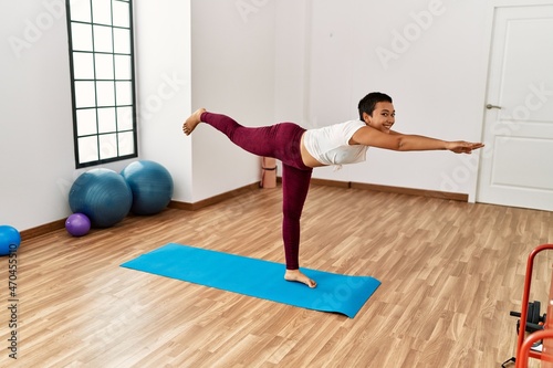 Young hispanic woman smiling confident training yoga at sport center