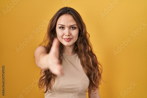Young hispanic woman standing over yellow background smiling friendly offering handshake as greeting and welcoming. successful business.