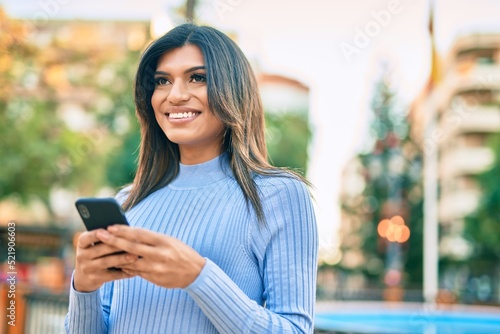 young, hispanic, latin, woman, female, adult, portrait, transgender, trans, happy, cheerful, lifestyle, joy, smile, smiling, happiness, positive, standing, laughing, expression, confident, smartphone, phone, technology, communication, cyberspace, mobile, business, mobile phone, using, texting, typing, outdoors, town, city, street, urban, day, outside