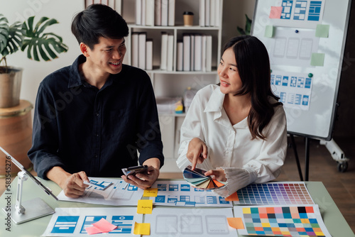 young husband and wife working at office by new project and happy