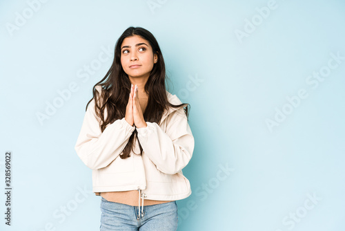 Young indian woman on blue background holding hands in pray near mouth, feels confident.