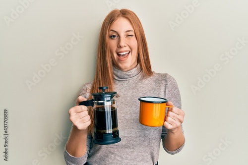 Young irish woman drinking italian coffee winking looking at the camera with sexy expression, cheerful and happy face.