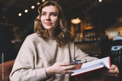 woman, content, peaceful, smile, smartphone, using, notebook, diary, cafes, thinks, female, free time, tranquil, young, cosy, contraption, device, good-looking, positive, lady, pensive, thoughtful, mobile, relax, casual attire, wavy hair, lifestyle, daydream, phone, modern, mobile phone, happy, contemporary, text message, messaging, dreamy, charming, long hair, contemplate, loose, jumper, baggy, sweater, looking away, daylight, indoor, inside, daytime, blurred background, horizontal