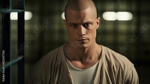 Young male inmate in prison uniform, man with shaved head portrait.
