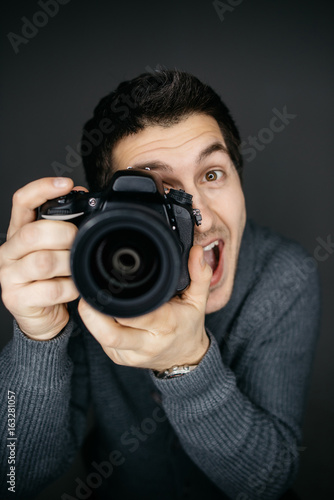 Young male photographer looking at the camera lens and smile. Funny expression. Studio portrait isolated on gray