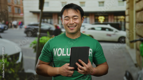 man, young, smiling, urban, street, green, shirt, tablet, volunteer, asian, city, happy, chinese, photogenic, adult, person, attractive, town, public, casual attire, community, aid, friendly, charity, support, helping, activity, service, initiative, manpower, effort, engagement, useful, cooperation, individual, human, citizen, pedestrian, metropolis, locale, downtown, bustling, economy, modern, active, life, tied-up, walking