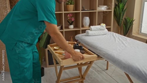 man, spa, wellness, massage, center, tray, supply, arranging, therapy, bed, treatment, relaxation, service, luxury, professional, healer, clinic, beauty, person, adult, client, health, interior, room, peaceful, indoor, organizing, environment, care, hand, procedure, comfort, serenity, dedication, routine, practice, lifestyle, atmosphere, soothing, towel, plant, relax, gentle, neat, pamper, harmony, overall, calm, background