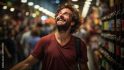 responsibility, young adult, merchandise, male, one person, shelf, retail, enjoyment, routine, photo, client, man, store, relaxation, shopping, expense, service, standing, indoor, rack, lifestyle, buying, arm, smiling, choice, happiness, chore, people, wine, looking, supermarket, choosing, fun, care, convenience, real people, holding, wine bottle, shopping cart, adult, hand, cheerful, shopping centre, avocation, city life, drink, young men, casual clothes
