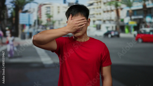 man, young, street, city, red, shirt, expression, covering, hand, urban, male, asian, gesture, emotion, lonely, tied-up, metropolitan, daytime, sidewalk, background, blurred, bokeh, fashion, casual attire, person, individual, standing, perspective, view, scene, lifestyle, modern, public, exterior, environment, posing, similarity, concept, symbol, face, hiding, culture, youth, dynamic, active, crowd, atmosphere, architecture