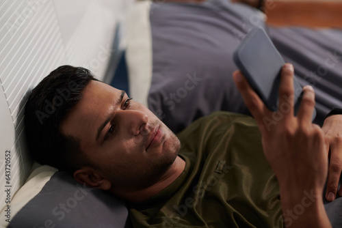 Young man in t-shirt looking through online news, watching video or chatting in smartphone while lying on bed in the morning or evening