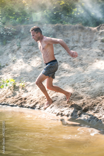 young man jumping into the river in the summer on a hot day