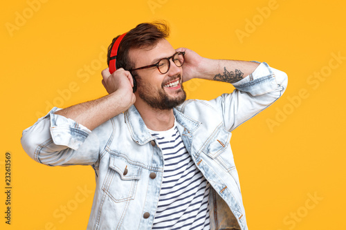 man, listening, music, earphones, smiling, looking away, style, casual attire, young, lifestyle, male, modern, device, contraption, technology, melody, hobby, joy, sound, earphones, excited, cheerful, happy, photogenic, attractive, guy, bearded, cool, leisure, rest, relax, song, confident, positive, contemporary, bright, high-coloured, vibrant, yellow background, horizontal, studio shot