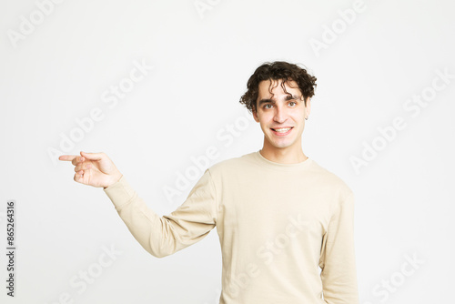 man, shirt, show, brunette, curly, casual attire, young, hand, guy, signs, male, working, isolated, photogenic, clothing, white, sitting, adult, studio, light, people, 1, caucasian, hold, portrait, smile, jean, front, standing, blue, person, gesture, copy space, looking, cheerful, background, point, happy, sporty, t-shirt