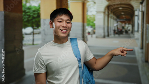 Young man smiling and pointing while standing outdoors in a city street with a blue backpack, showcasing a vibrant and urban lifestyle.