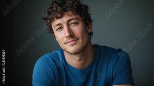 Young man smiling warmly, soft light enhancing his cheerful expression, minimal background.