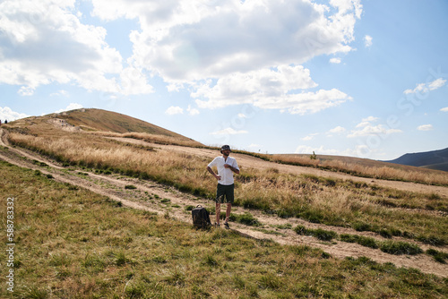 Young man standing on the hill of the mountain. Feeling happy and free. Natural landscape in summer. Sunny rural scenery. Nature protection concept. Breathtaking mountain view.. On top of the world