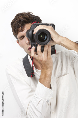 adult, camera, concentration, half-length, hobby, holding, lifestyle, male, man, nostalgia, 1, one person, people, photographer, photographing, retro, shirt, shooting, studio shot, technology, vintage, white background, young adult