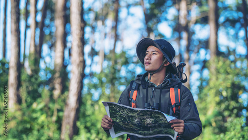 Young Man Traveler with map backpack relaxing outdoor with rocky mountains on background Summer vacations and Lifestyle hiking concept