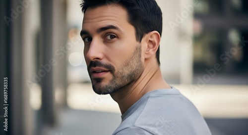 Young Man with Dark Hair and Beard Wearing Light Gray T-shirt Looking Over Shoulder in Urban Outdoor Setting