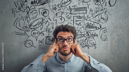 Young man with glasses expresses frustration amidst chaotic doodles on wall in urban workspace