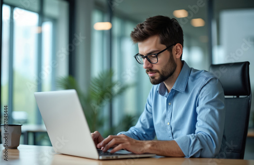 Young man with glasses works on a laptop in a modern office. He concentrates on his task, typing on the keyboard at his wooden desk. Person works indoors with plants in background.