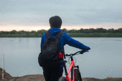 Young man with headphones walking with his bike beside him, appreciating the scenery, active lifestyle.