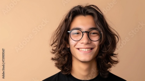 Young man with long hair wearing glasses smiling against a beige background.