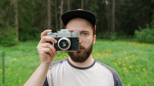 Young Man with retro photo camera outdoor hipster Lifestyle forest nature on background