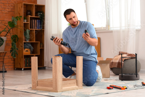 Young man with tools assembling wooden table at home