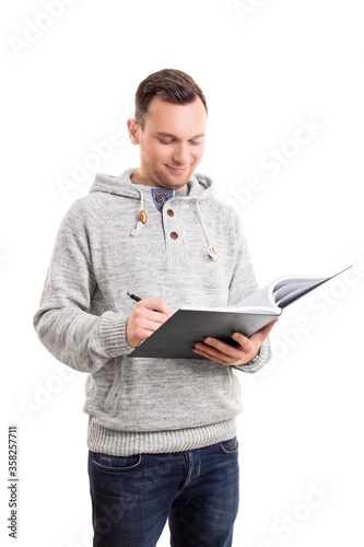 student, male, notebook, book, young, writing, smiling, education, man, college, studying, university, homework, study, isolated, exam, white, background, photogenic, casual attire, confident, holding, looking, guy, cognition, notepad, working, freelance, paperwork, standing, friendly, textbook, hand, adult, cheerful, smile, cute, positive, 1, class, smart, boy, portrait, happy, school, pen, write, learning, back to school
