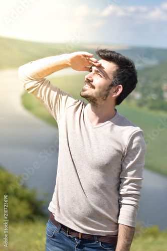 young, happy, leisure, male, nature, people, sun, cloud, man, countryside, freedom, landscape, park, sky, success, horizon, activity, adventure, altitude, backpack, cliff, climber, climbing, endurance, evening, extreme, high, hike, hiking, hill, journey, morning, mountain, peak, relaxing, rock, sea, sport, standing, stone, sunlight, tour tourism, holiday maker, travel, traveler, trekking, vale, view, hand, relax