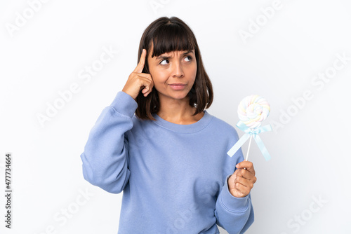 Young mixed race woman holding a lollipop isolated on white background having doubts and thinking
