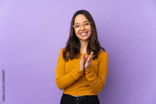 Young mixed race woman isolated on purple background applauding after presentation in a conference
