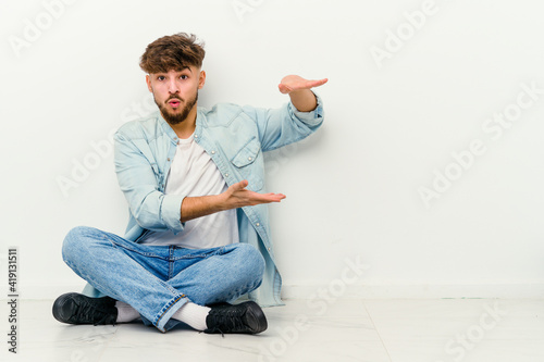 Young Moroccan man sitting on the floor isolated on white background holding something with both hands, product presentation.