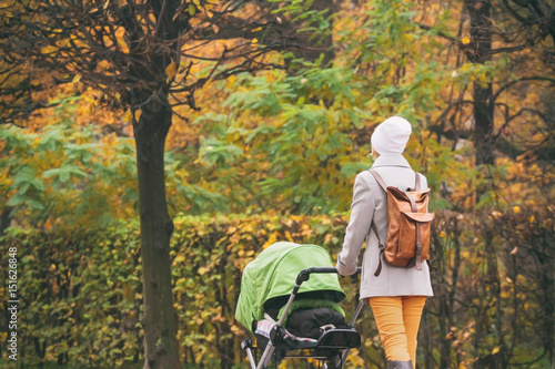 Young mother pushing stroller in autumn park