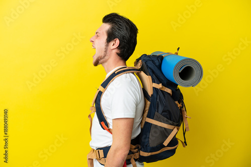 Young mountaineer Russian man with a big backpack isolated on yellow background laughing in lateral position