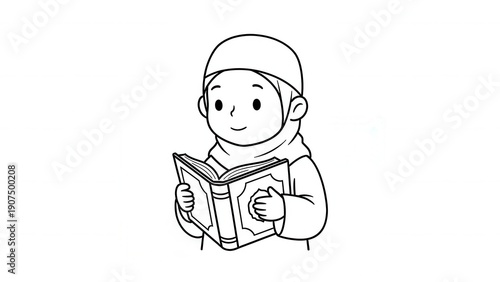 holy book, koran, mosque, prayer, faith, devotion, tradition, cultural, arabian, middle eastern, learning, cognition, wisdom, spirituality, worship, peace, serenity, innocence, childhood, cartoon, illustration, drawing, outline, simple, clean, white background, isolated, graphic, design, symbol, icon, education, children, muslim, islam, koran, book, reading, religious, holy